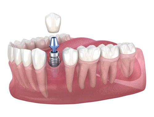 A dental implant is a small post, usually made of titanium, that acts as a substitute for the root of your natural tooth. Another piece, called an abutment, is connected on top of the implant. The job of the abutment is to hold the last piece of the implant process which is the crown ( the part you actually see when you smile or open your mouth). The crown is fabricated to match your natural teeth.